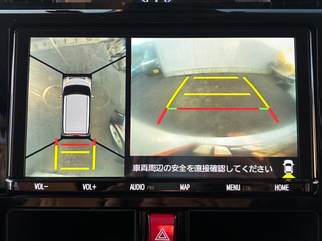 上の写真のように、車を真上から見たような視点で周囲を確認できるので